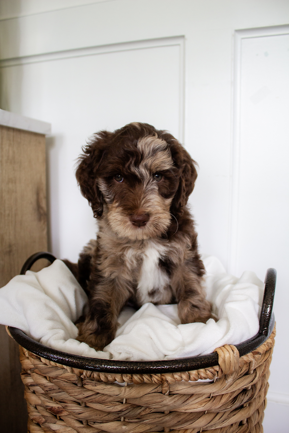 Meet Slate Mowsley, our mini chocolate merle goldendoodle. We are thrilled to have him join our program as the first chocolate addition! Slate is currently 10 weeks old and is expected to be around 30lbs full grown. He lives in a wonderful guardian home! He is calm, playful, eager to please, and loves his humans! They say that training has been going wonderfully - he knows sit, lay down, and stay!